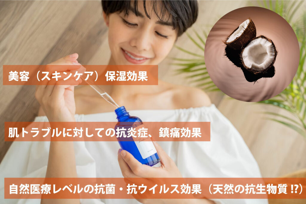 ココナッツオイルは、高品質なスキンケアアイテムとしても人気があります。ココナッツオイルに含まれる「ラウリン酸」には、保湿効果や殺菌・抗菌効果、紫外線予防効果、血行促進効果など、嬉しい効能が豊富に含まれています。