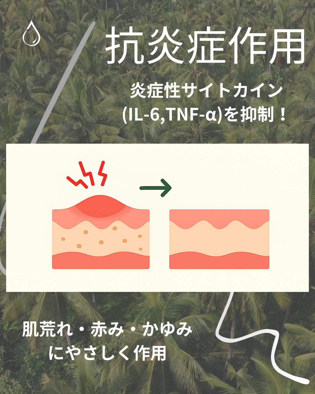 ラウリン酸には高い殺菌・抗菌効果が含まれています。そのため、ニキビの発生を防ぎたい場合やアトピー性皮膚炎でお悩みの方、予防したい方に最適です。