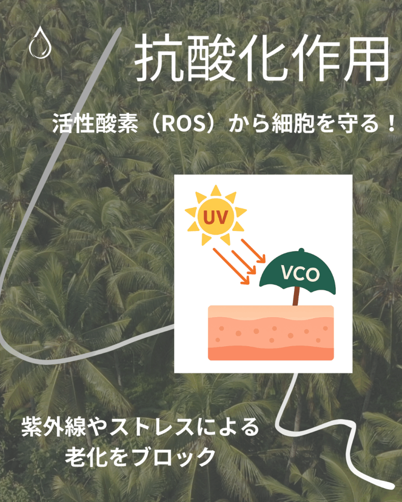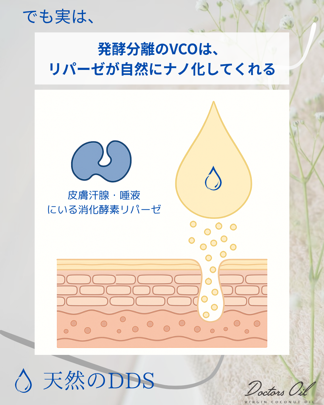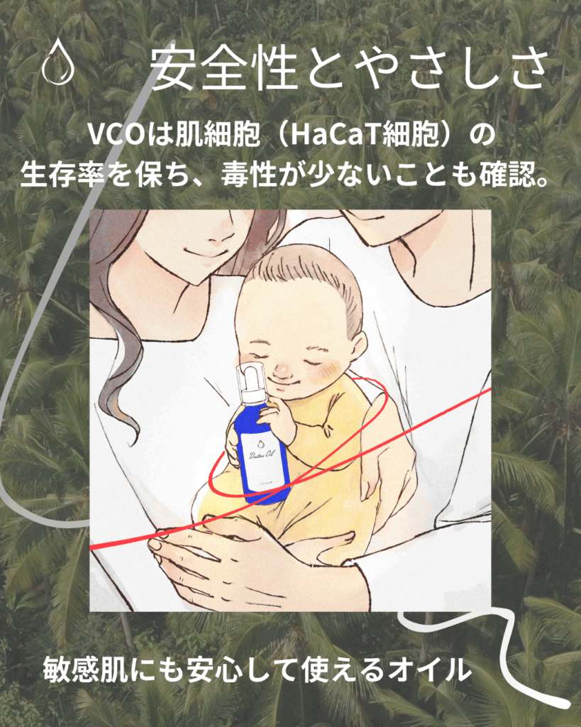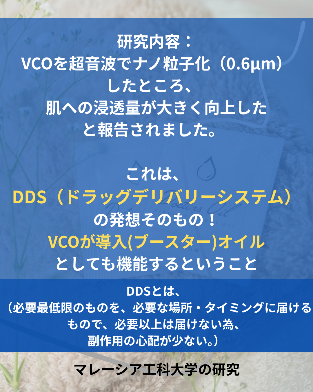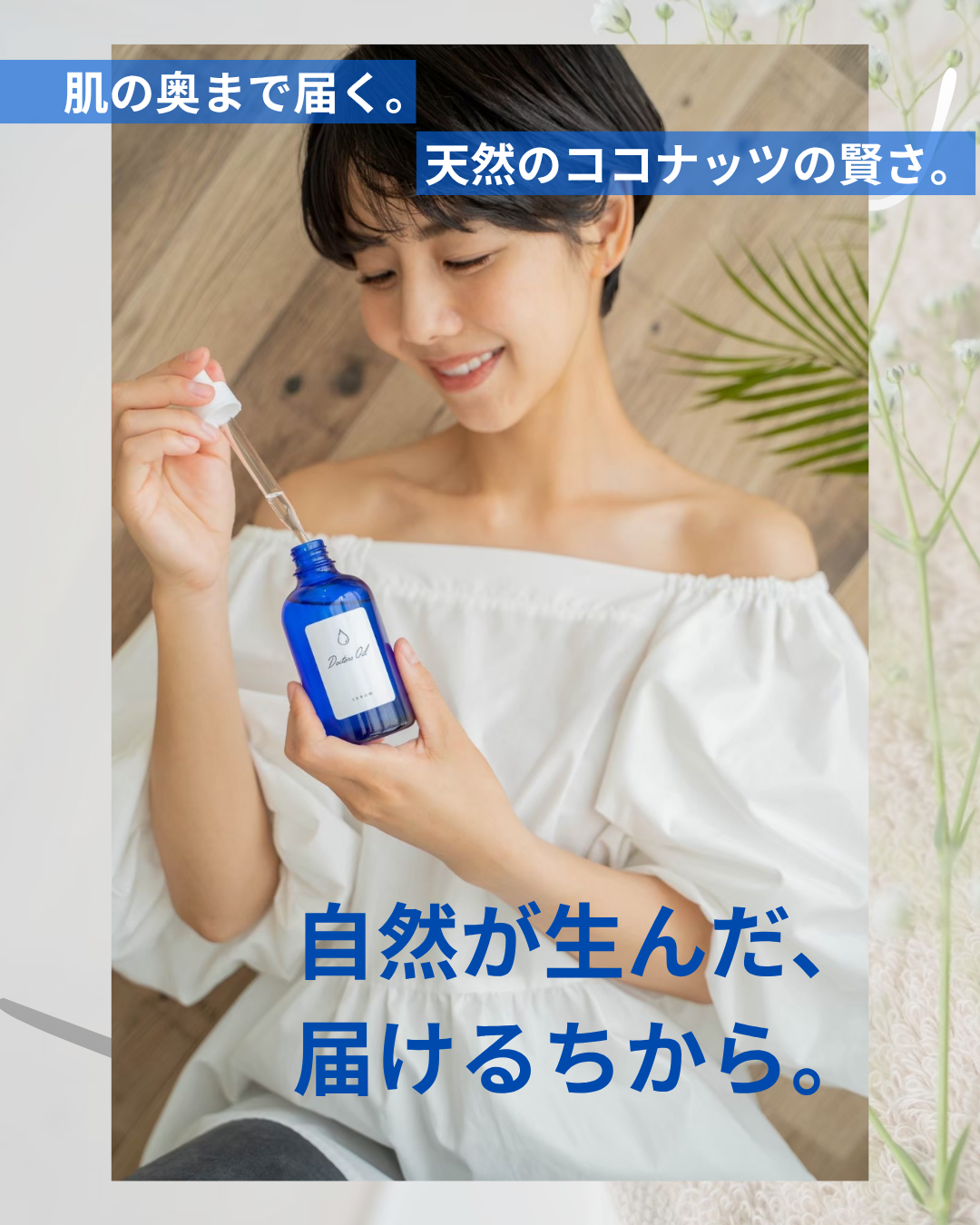 さらに発酵分離で抽出したVCO(バージンココナッツオイル)は皮膚上にいる汗腺リパーゼという消化酵素と出会う事でナノ化に分解され皮膚深くまで浸透する事が確認されており、ブースターオイル(導入液)としてスキンケアに活躍できます。